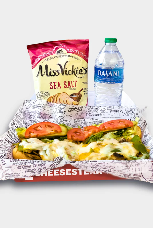 Charleys Steak Cheesesteak Boxed Meal includes a steak cheesesteak made with grilled USDA choice American cheese and served on our signature toasted roll. Lettuce, tomato, and mayonnaise packets are provided on the side. Consider adding Miss Vickie's Chips, Dasani bottled water, and a Chocolate Chunk Cookie to complete your meal.