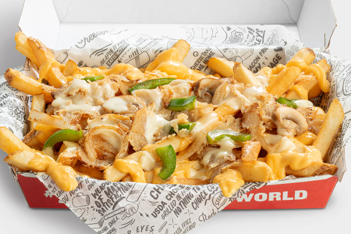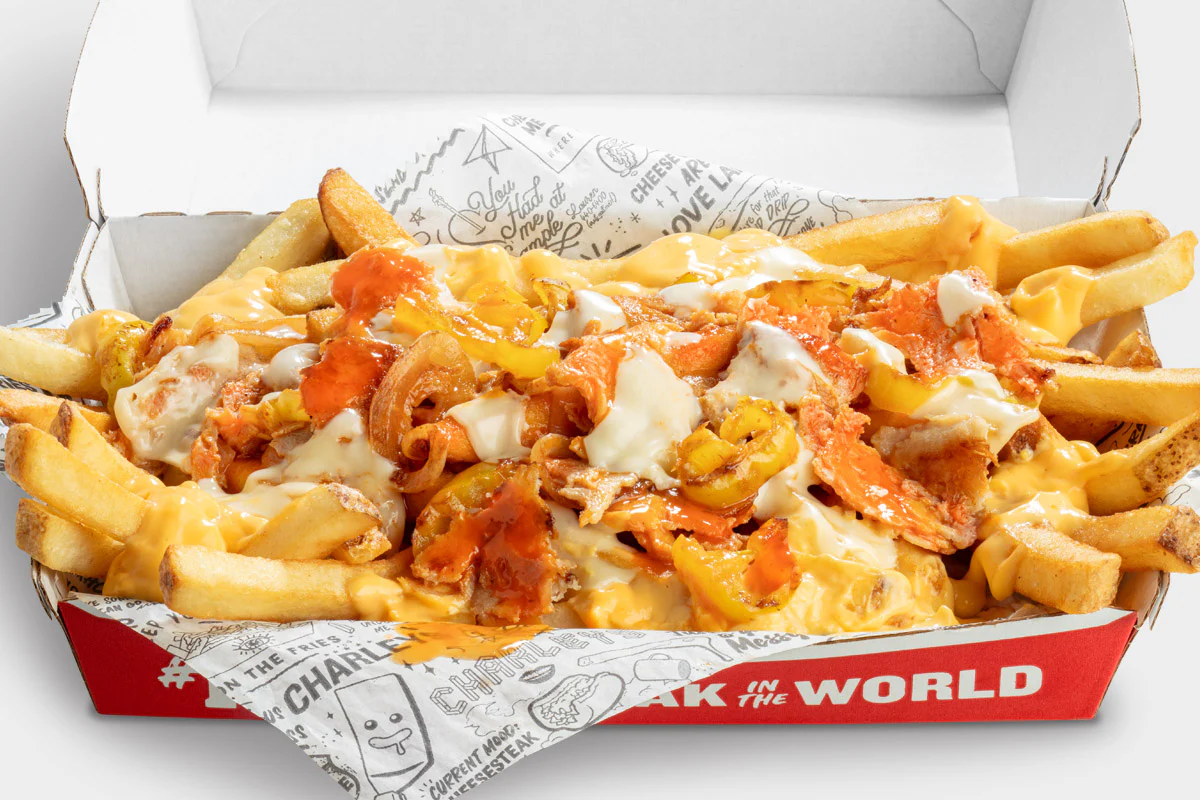 Charleys famous fries topped with cheese sauce, loaded with extra grilled USDA-choice steak, Cheez Whiz®