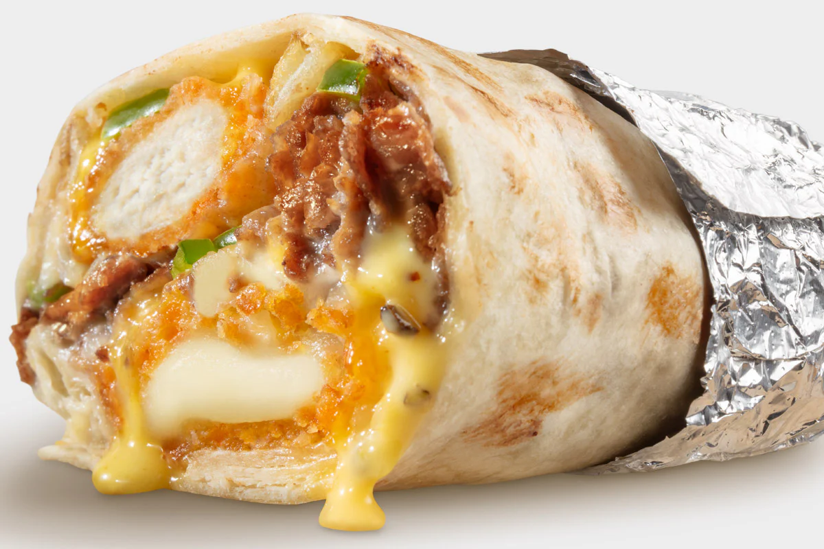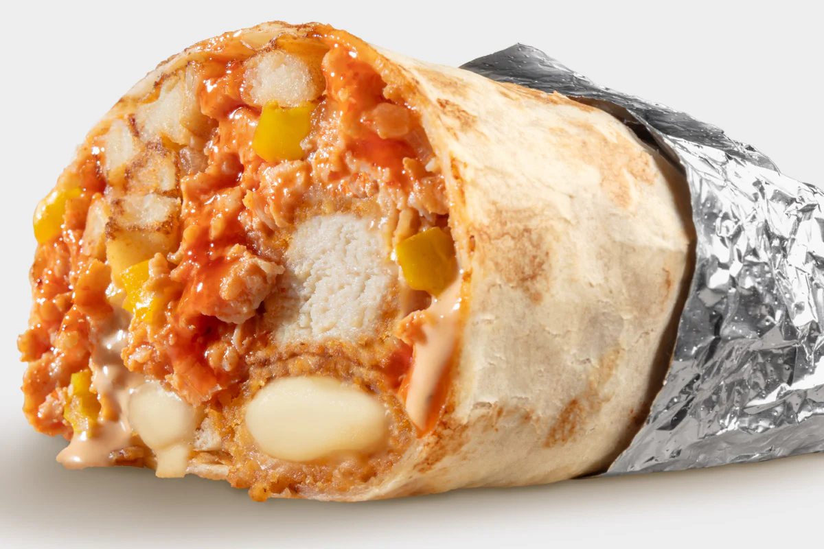 Fat Firebird is a warm flour tortilla stuffed with all natural white meat chicken grilled with spicy buffalo sauce, onions, and banana peppers, topped with melted american cheese, chicken tenders, mozzarella sticks French fries and drizzle of ranch.
