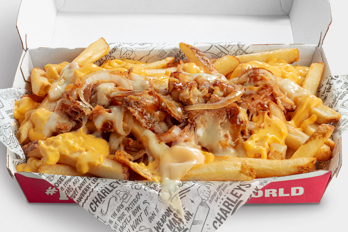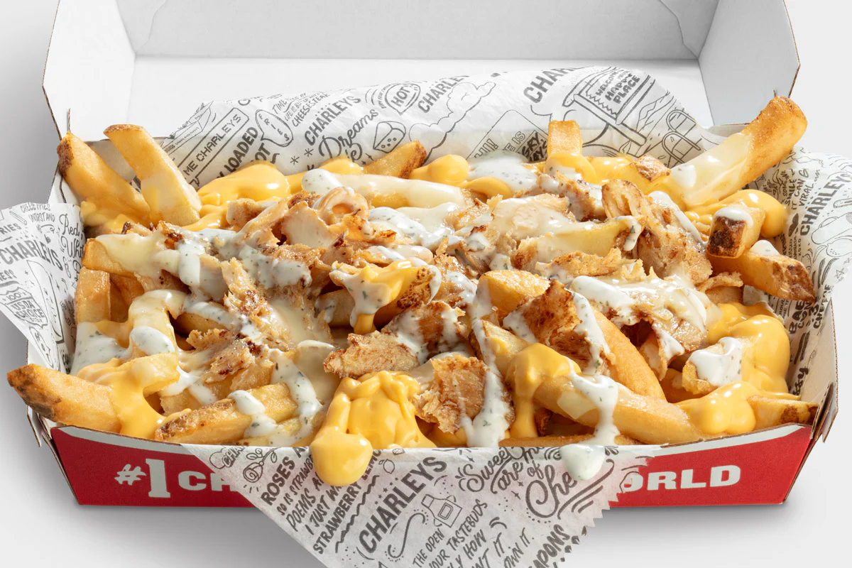 Charleys famous fries topped with cheese sauce, all white meat chicken topped with melted American cheese, and ranch dressing