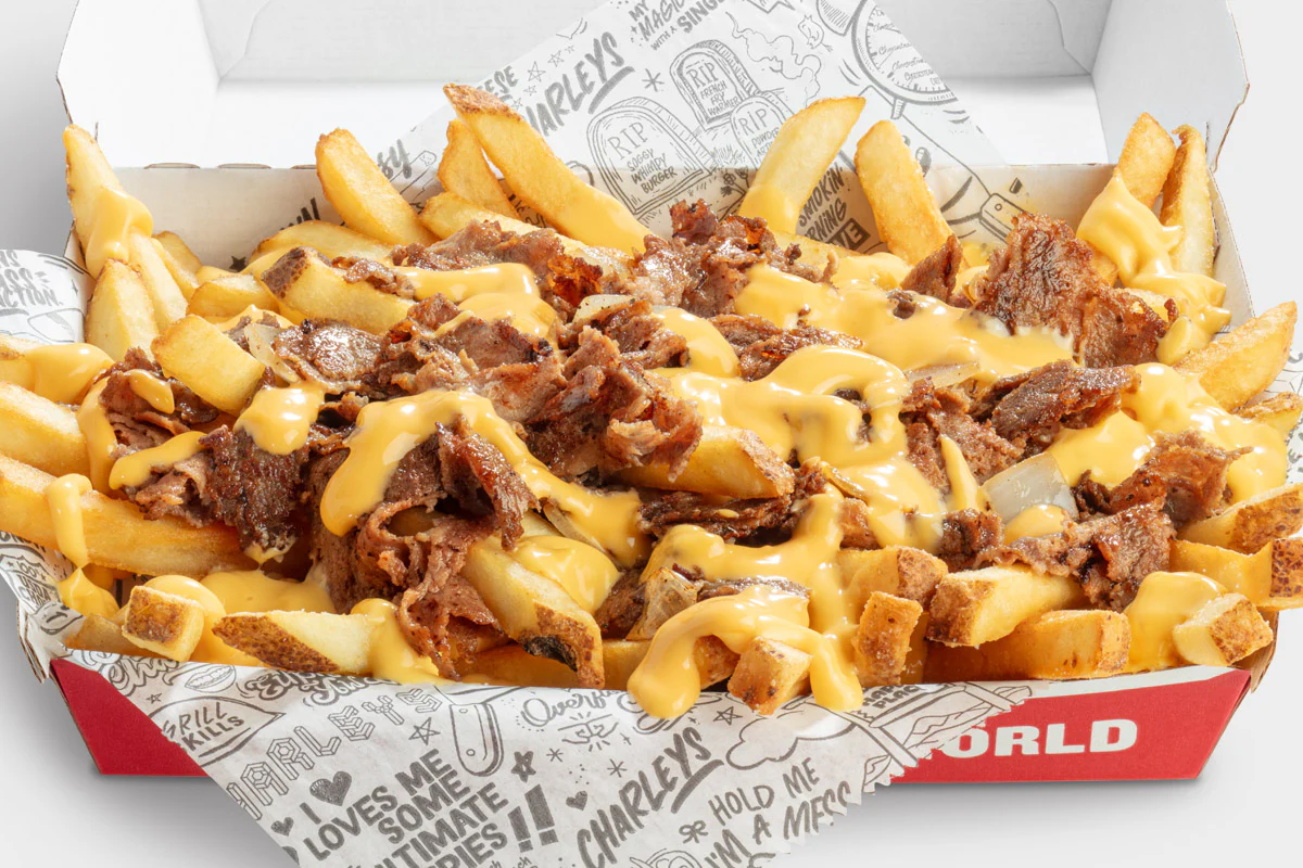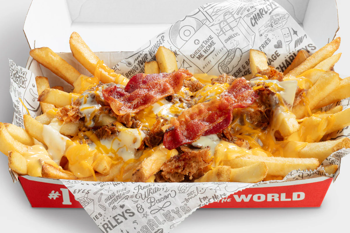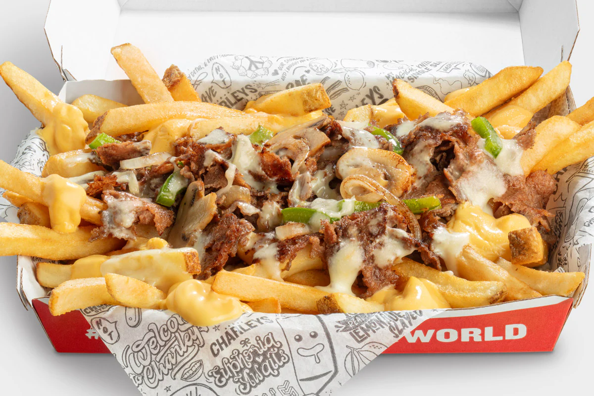 Charleys famous fries topped with cheese sauce, grilled USDA-choice steak topped with crispy, salty bacon and melted provolone, American, and cheddar