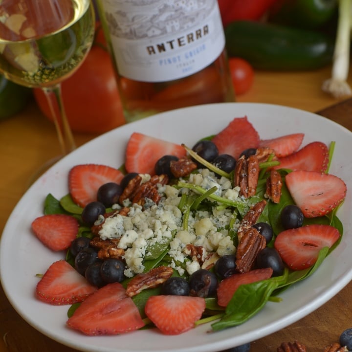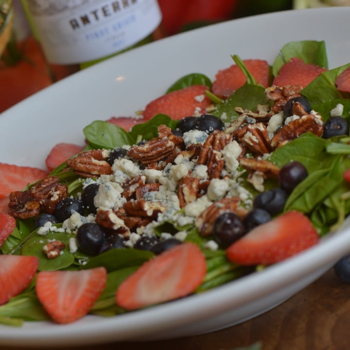 Spinach, pecans, blue cheese, strawberries, blueberries, raspberry vinaigrette