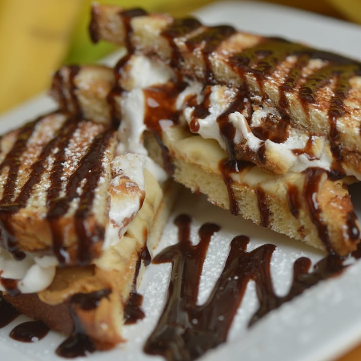 grilled challah bread, peanut butter cream cheese honey mix, banana slices, marshmallows, hazelnut spread,