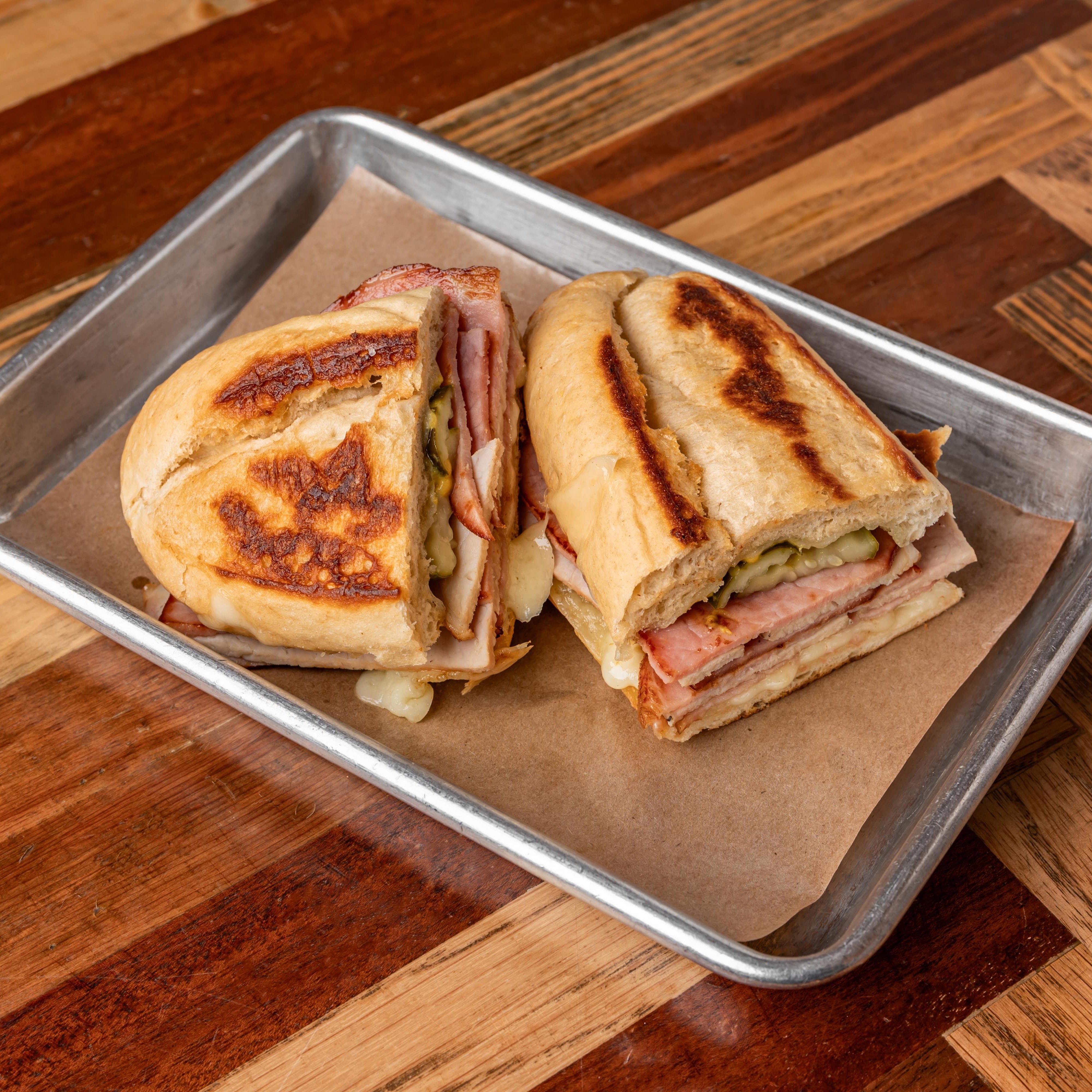 sourdough, pork, ham, swiss, spicy dijon mustard, pickles