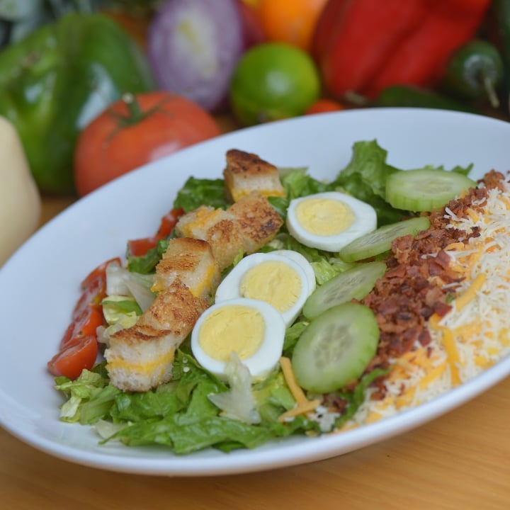 Romaine, iceberg, cucumbers, tomatoes, egg, cheese, bacon, croutons, choice of dressing.
