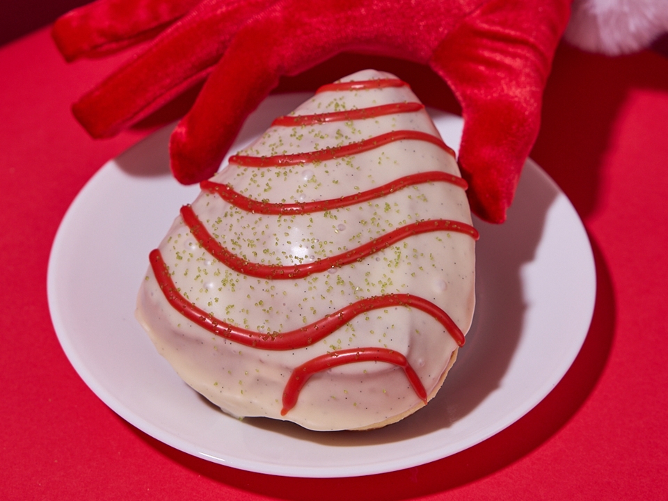 24hr tree shaped brioche filled with housemade marshmallow fluff, white chocolate glaze & drizzled in a natural coloring red glaze & green sugar. Inspired by the nostalgic Little Debbie Christmas Tree.