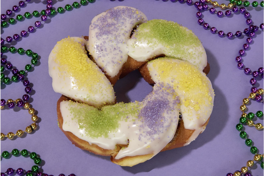 24 hr brioche braided into a knot, layered in cinnamon sugar, finished with traditional glaze and Mardi Gras sugar in yellow, green, and purple.