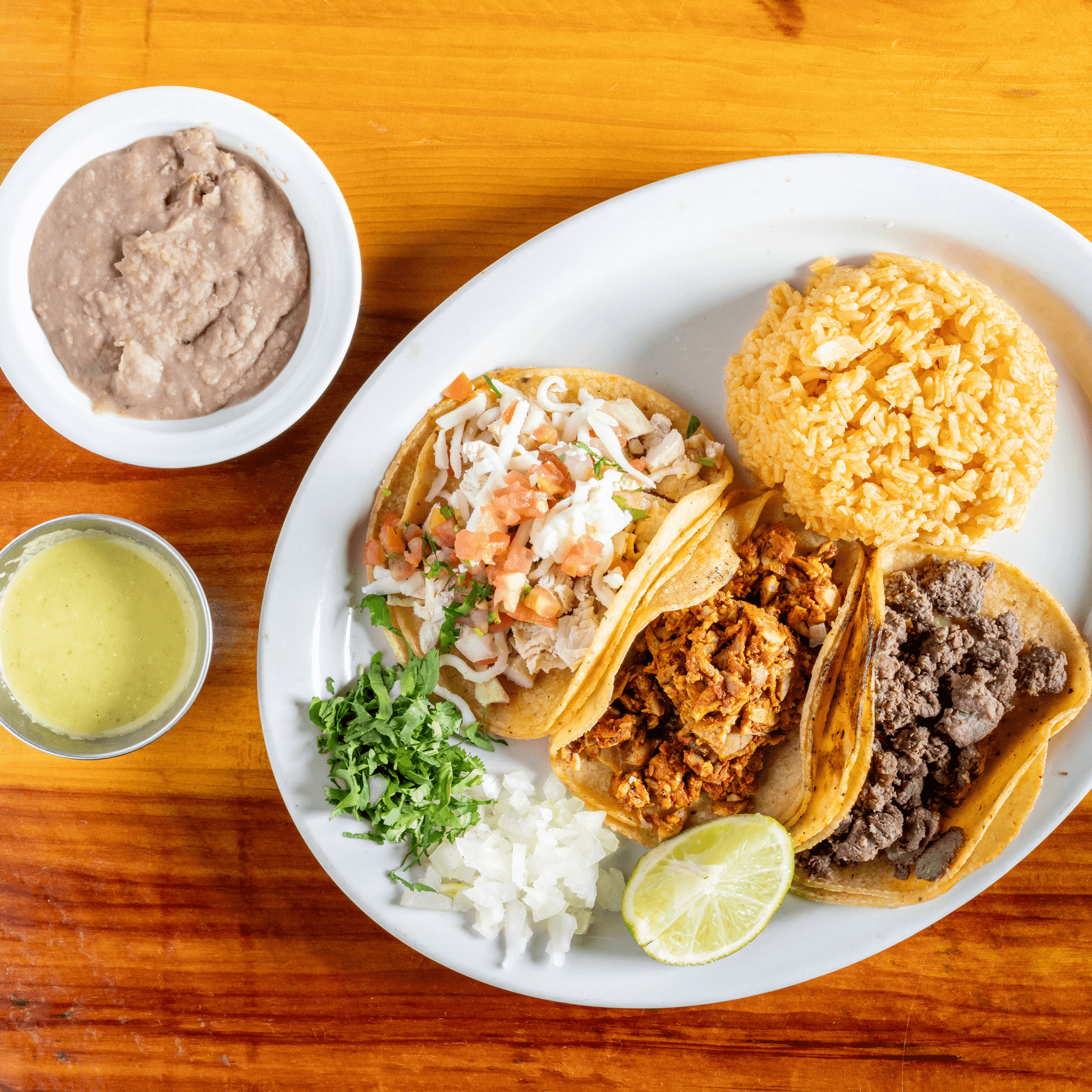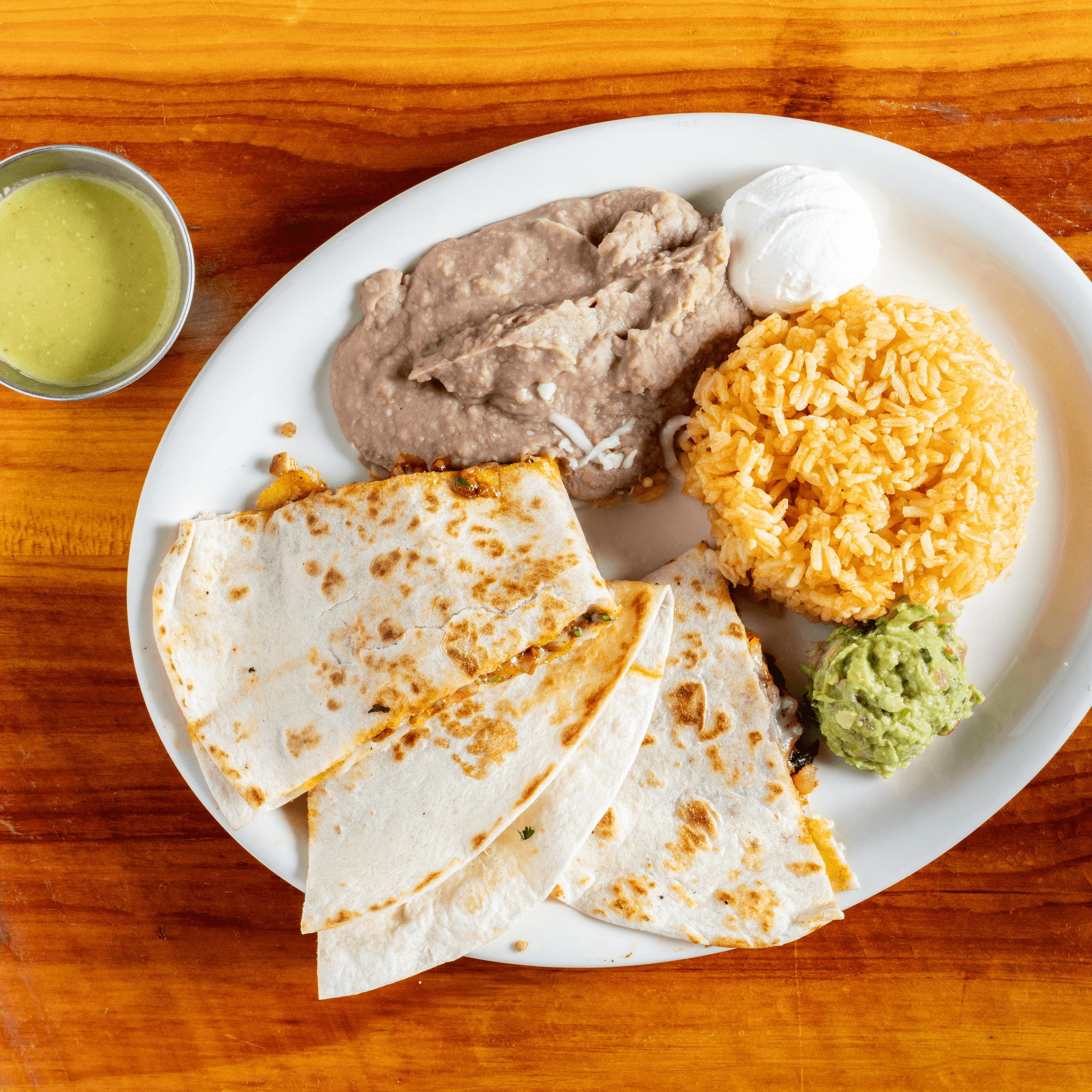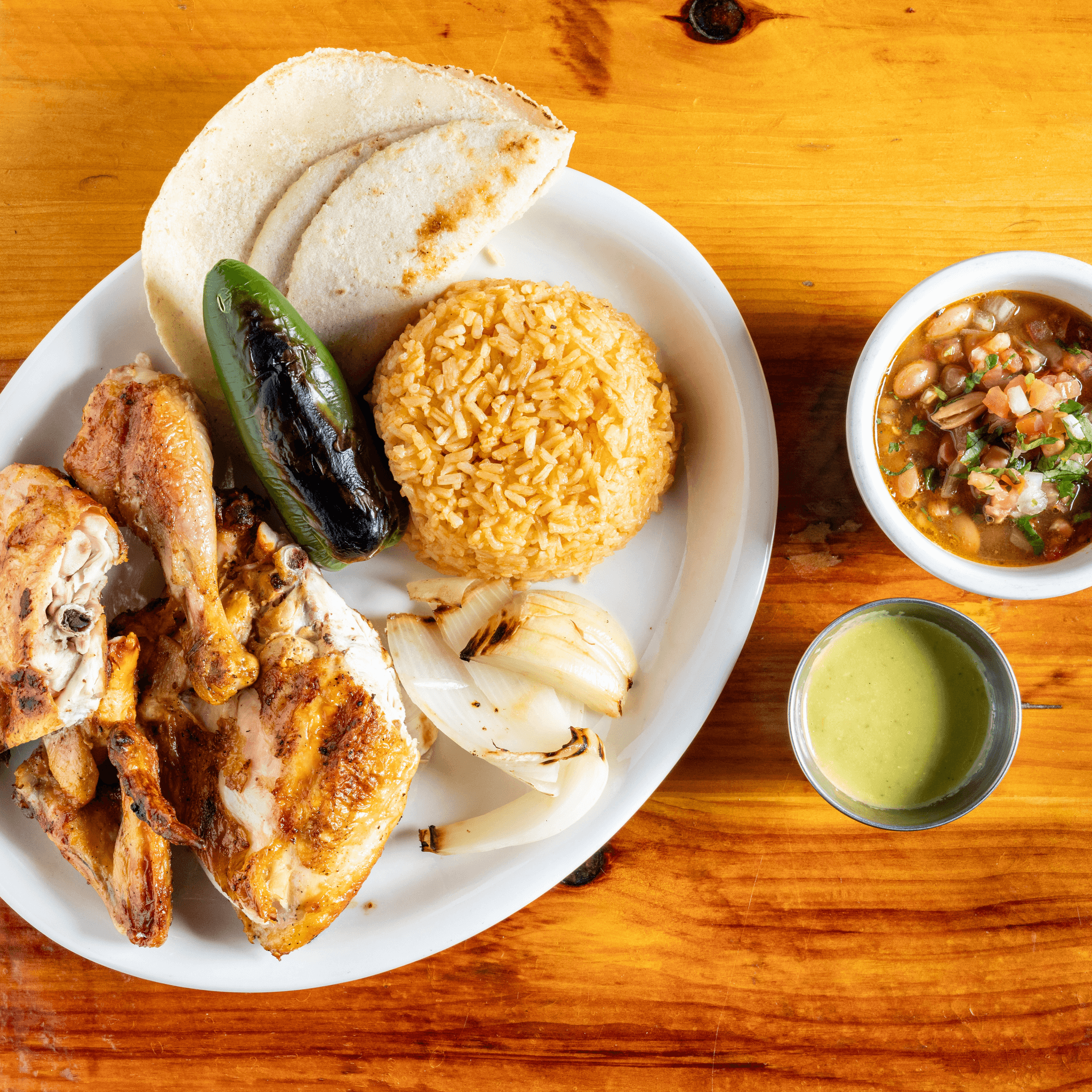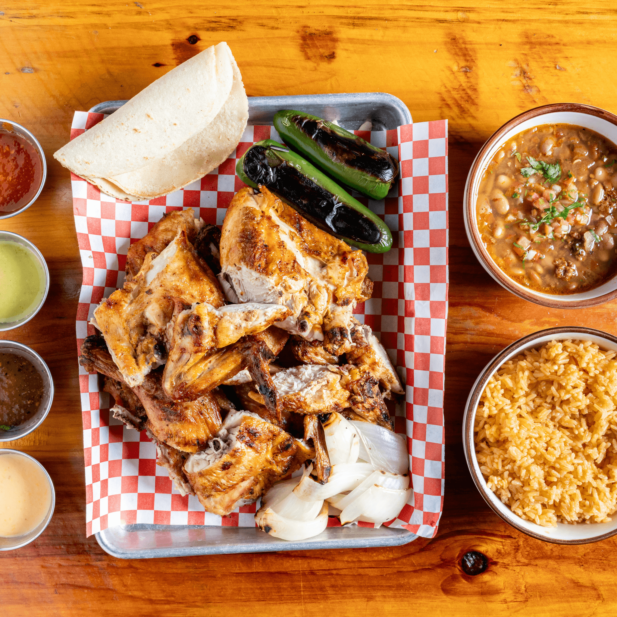 1/2 lb beef fajita, 1 grilled chicken thigh, rice and beans, guak and sour cream, tortillas and salsa and grilled sausage