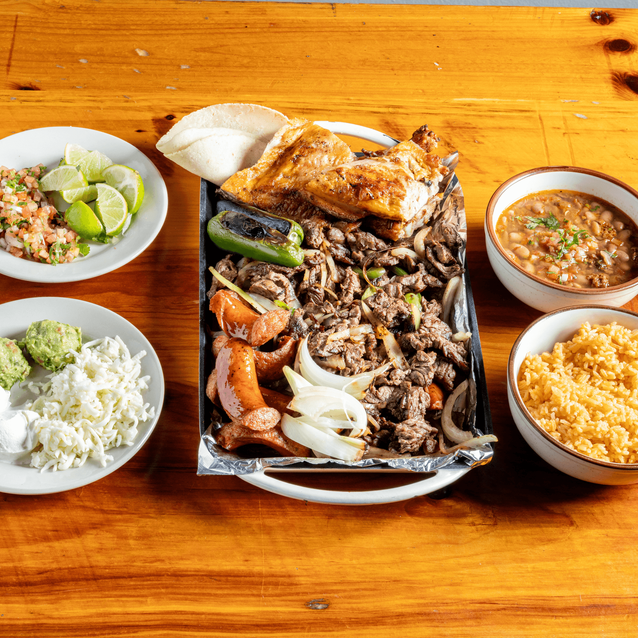 1/2 lb beef fajita, 1/2 grilled chicken, grilled sausage, rice and beans, tortillas and salsa, guacamole and sourcream scoop,